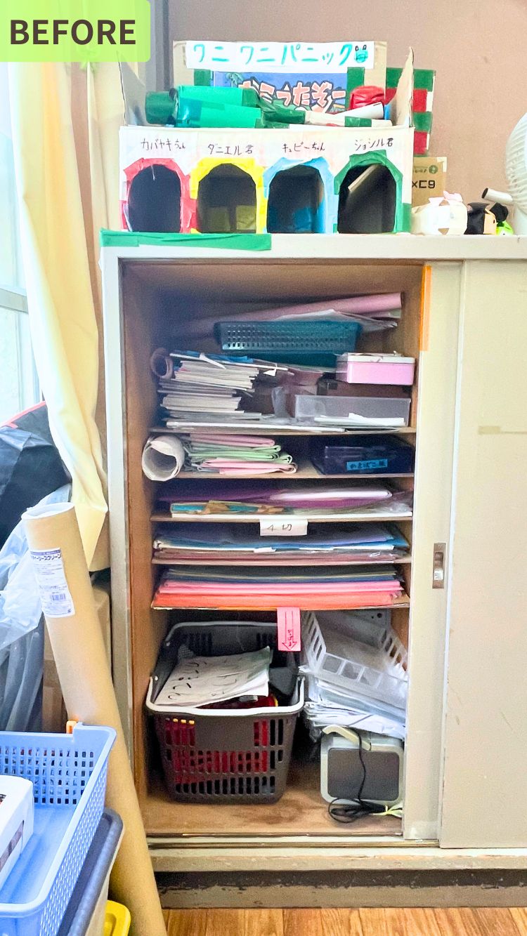備品棚の中には、文房具・テープ類・お菓子・教材などさまざまなアイテムがぎっしり詰まっており、どこに何があるかが分かりづらい状態でした。