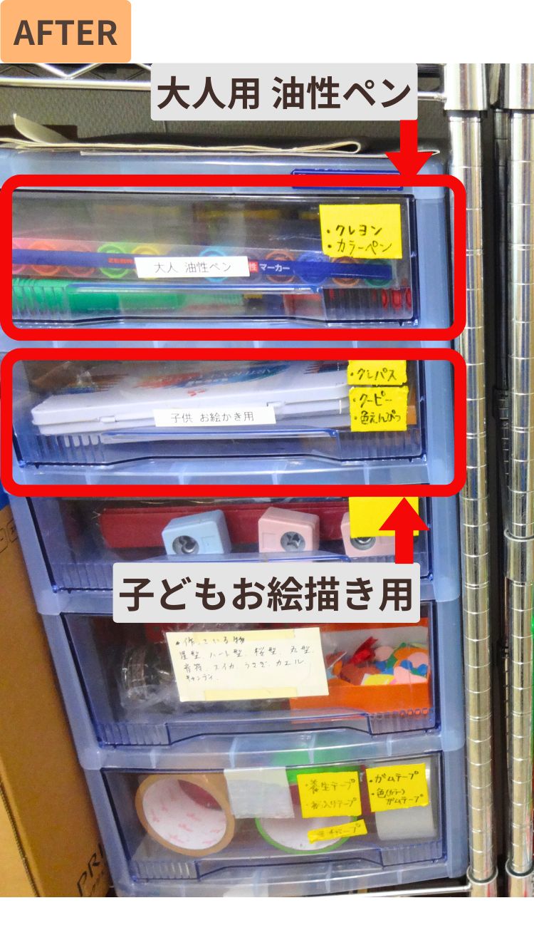 • 子ども用の収納:①折り紙を色分けに収納してわかりやすい見出しをつけたこと。
