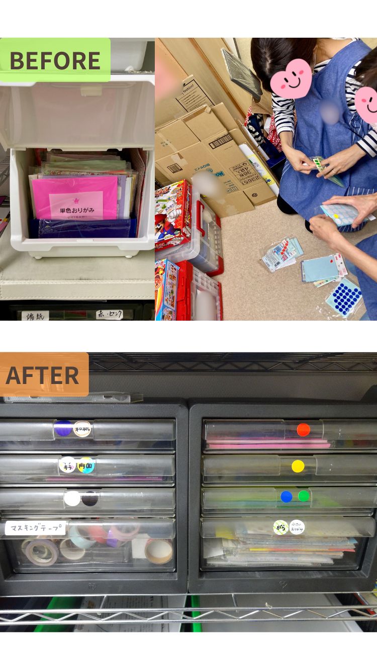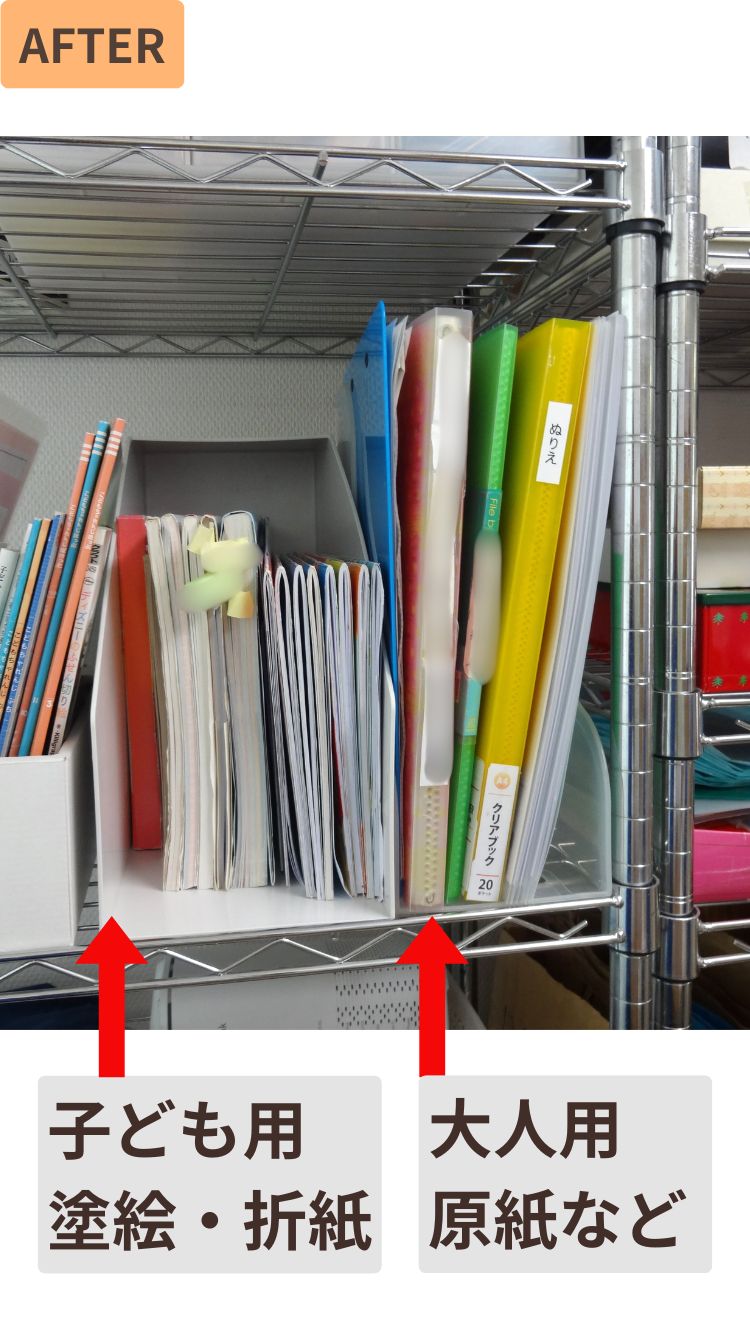 • 子ども用の収納:②ぬりえをキャラクター別にファイルに入れたこと。→どちらも実際に子どもが自分で選んで取り出すことができました。ワサ~っとあふれ出るストレスからも解放されて、子どももスタッフも楽ちんでした!