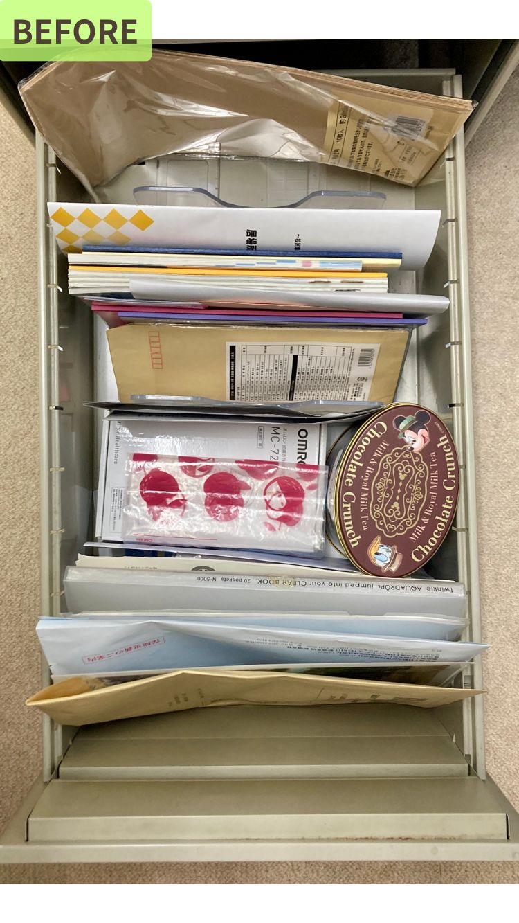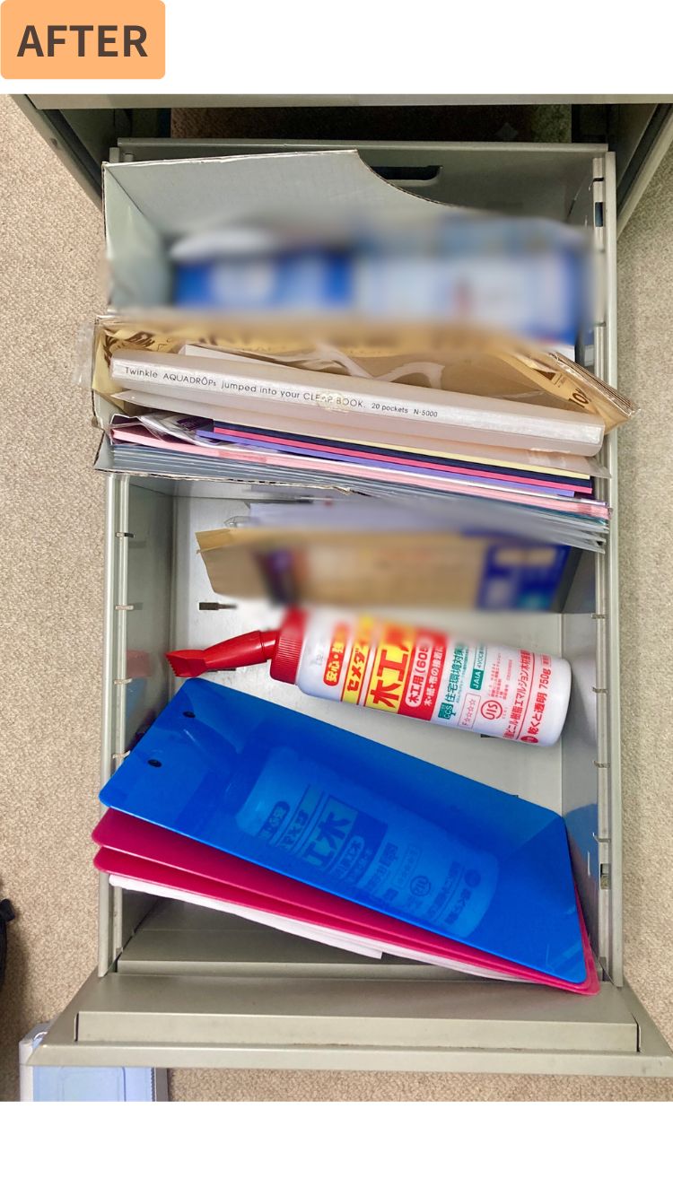 • 事務ファイルを机の中に立てて収納したり、収納グッズの使い方次第で取り出しやすくなり、何よりスッキリした事です。