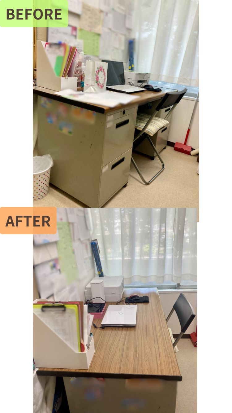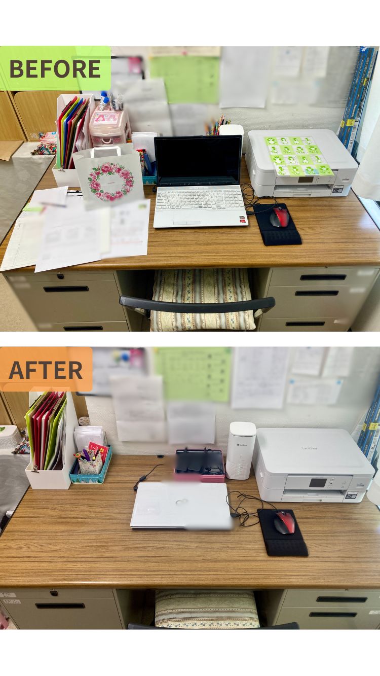 作業デスクの上の整理前(左)と整理後(右)の比較画像。整理前は書類や収納ボックスが多く置かれているが、整理後はスッキリと片付き、作業スペースが広く取られている。